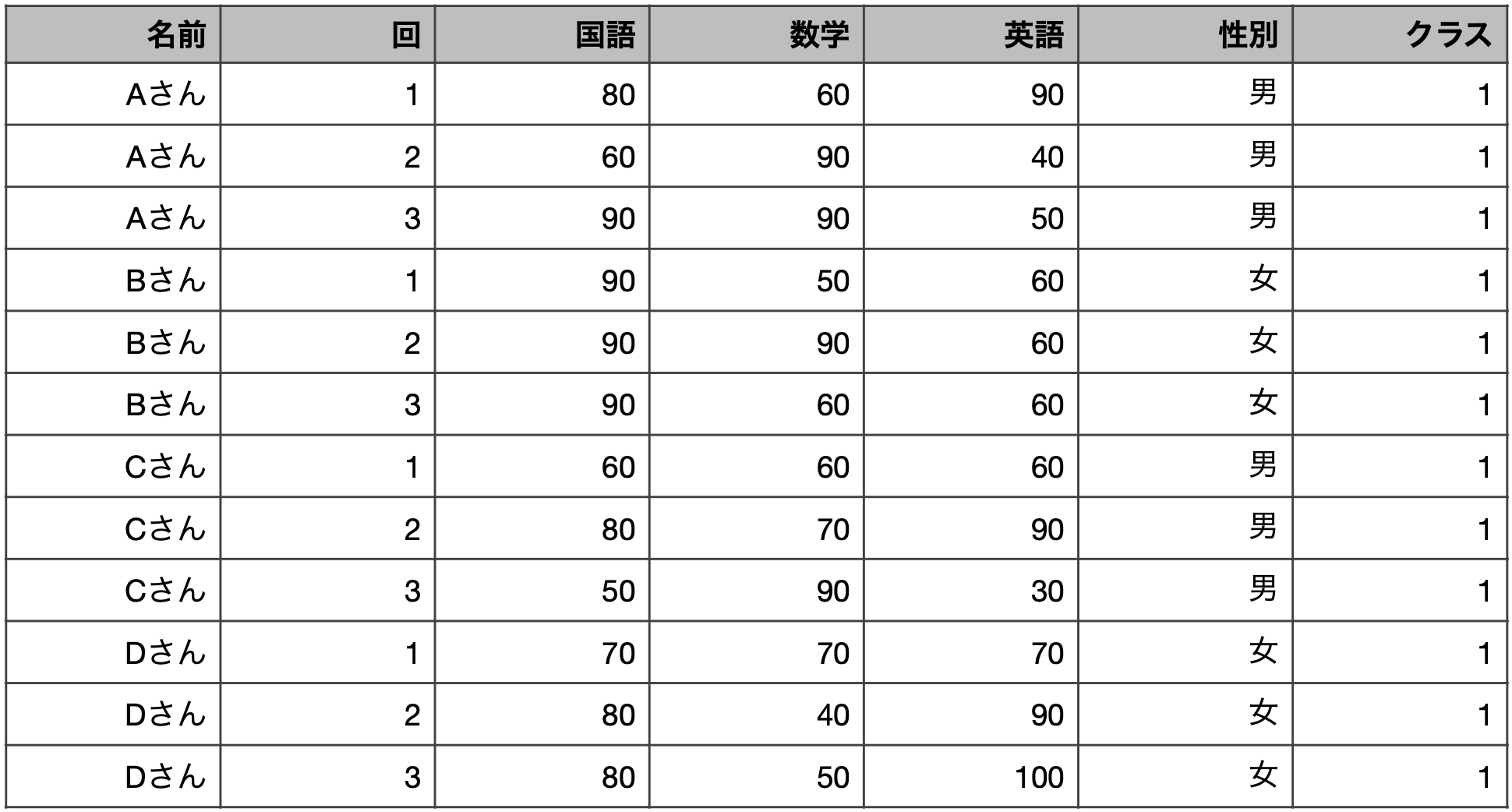 id: 学籍番号class: クラスgender: 性別test: テストの点hometown: 出身地3_test.csvというファイルをtestという名前でRに読みこませる