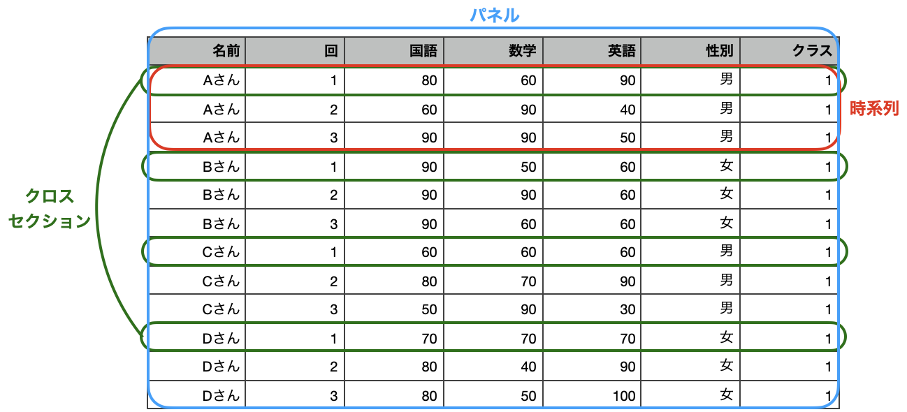 | 質的変数 | 名義尺度 | 性質を分類するために使われる(男 = 0, 女 = 1、のように性質に数値を割り当てる)。数値に意味はない。比較も計算もできない | 性別、学籍番号 |